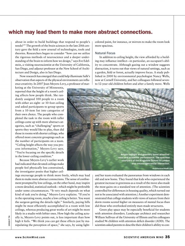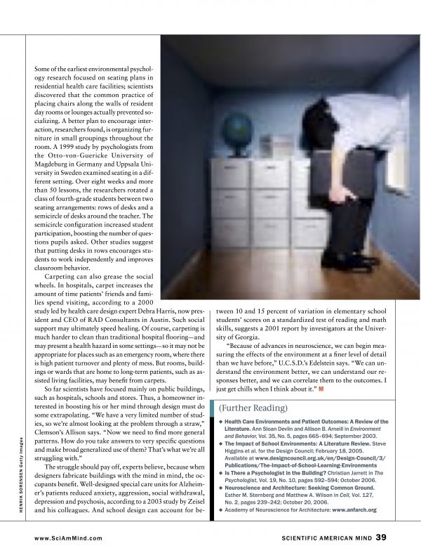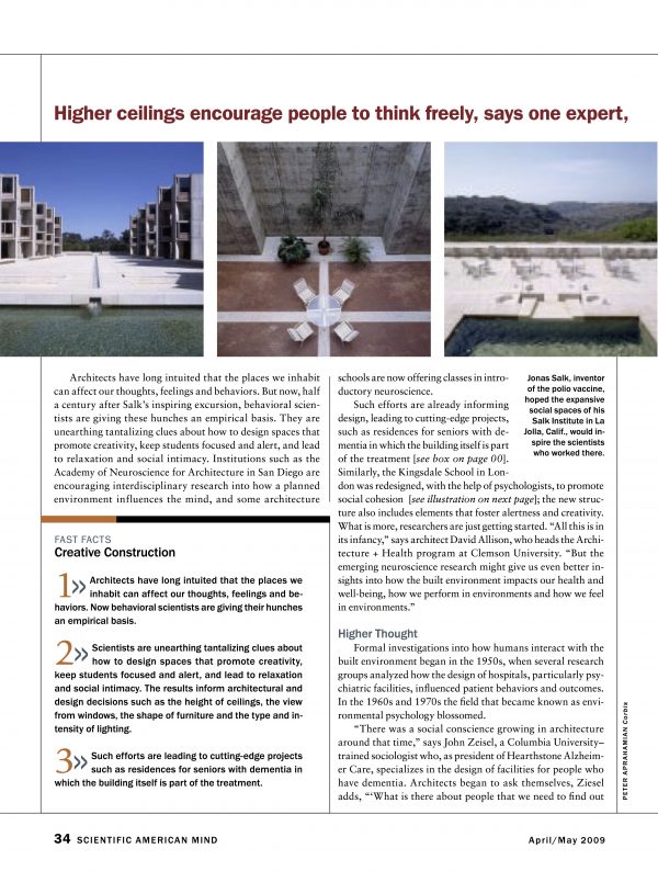 Dubbed ‘the scientific search for the soul’ within a Western consumer culture where the mind and body are understood as separate entities, the revolutionary data enlightening those in the cognitive and neuro-sciences is beginning to provoke paradigm shifts within the architectural profession, through academic institutions such as The Academy of Neuroscience for Architecture and literature from respected architectural theorists such as Alberto Perez-Gomez and Juhani Pallasmaa. The practical knowledge base provided the architectural community through this collaborative nature between both architects and neuroscientists, is allowing us to better understand how architectural settings influence human experience and how the human mind (and its instrument, the brain) react continuously to these settings. According to John Paul Eberhard, author of Brain Landscape: The Coexistence of Neuroscience and Architecture, this research is elevating our understanding of “how classroom design affects the cognitive processes of children, how the design of hospital rooms could impact the recovery rate of patients, how working environments likely impact the productivity of white-collar workers, how sacred spaces install a sense of awe in those who worship there, and much more.”