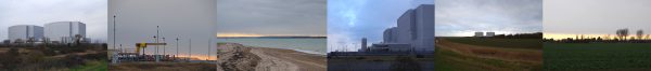 Soon two large structures loom into view. They are uniform, in smart grey corrugated metal cladding which is more-or-less legible against the stormy clouds as they pass behind them. They house the twin Magnox reactors, in their original buildings, of the Bradwell Nuclear Power Station, which was switched off in 2002 after 40 years’ service providing electricity to Southend, Colchester, Chelmsford and beyond. It’s been being gradually decommissioned since then, and the reactor buildings were over-clad as part of this process. The power station was sited here due to the low agricultural value of the land on an old military airfield, and the plentiful cooling water from the sea.