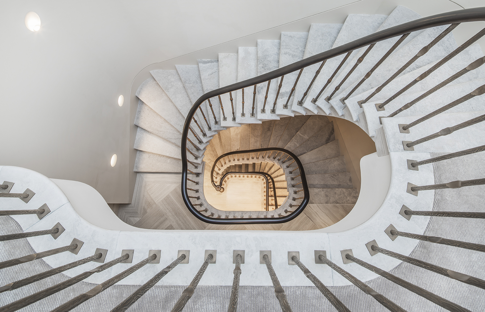 In 2012, HUB Architects created this elegant winding cantilever staircase with patinated metal stair railings for a private residential project.